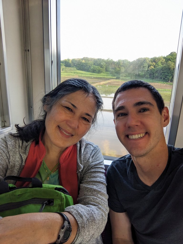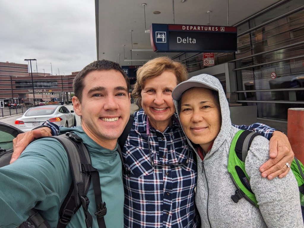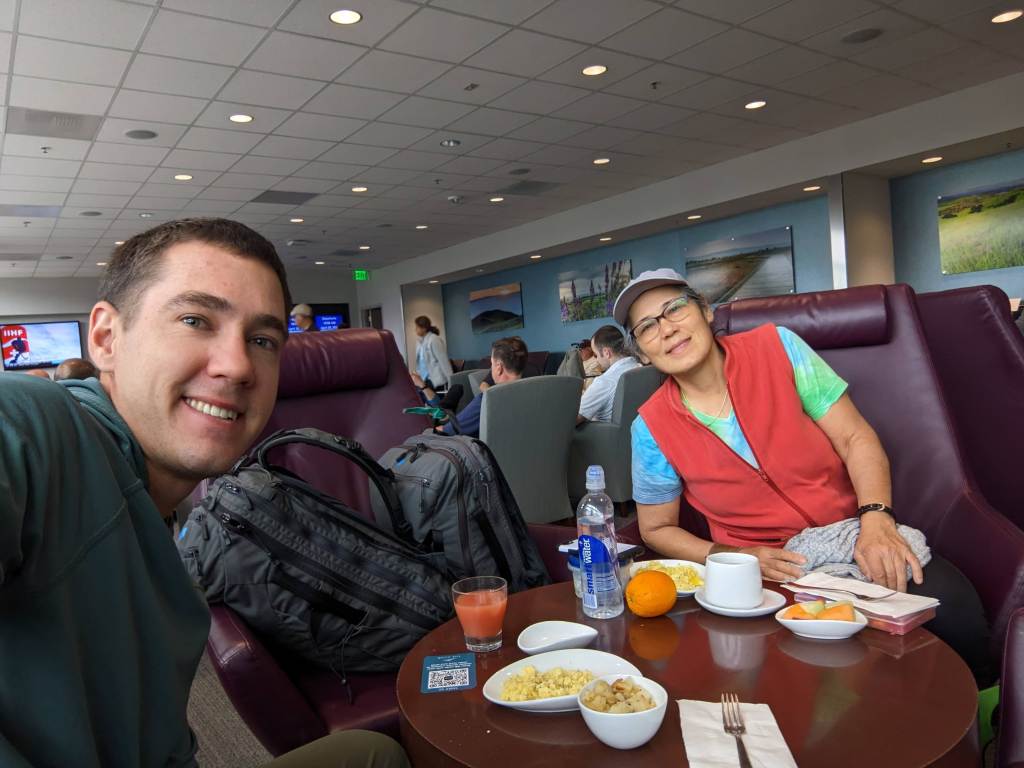 It felt familiar to wake up in my hometown of Los Gatos – yet unfamiliar to wake up in Los Gatos but in a friend’s house on the other side of town. Mom and I ate a small breakfast, drove over to Frannie’s where we picked up Frannie and Grandma Vicky and then dropped off Grandma at Caltrain for her to go back home to San Francisco. Frannie then took us to SJC for our flight to Japan. Thank you Frannie for dropping us off and looking after my car for a couple months! Mom and I hung out in the lounge waiting for the flight. Worse than expected: scrambled eggs. Better than expected: grapefruit/orange juice mixture (fun fact: Dale and I called this a “Beau Dale” back in college when we’d make them in the UCLA dining halls).