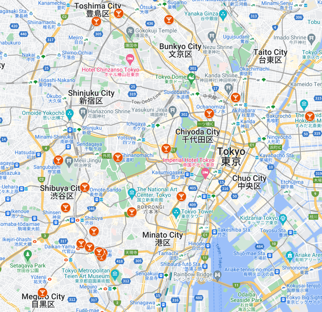 It’s worth noting that in Japan, vending machines in general and especially drink vending machines are extremely common – typically located on the street/sidewalk. For this challenge, I did not have to do any research or map-looking to locate vending machines. I relied on the simple strategy of going about my day, making sure to incorporate some walking knowing that while out and about, I would end up at a vending machine. On day 1, I decided at the end of the challenge that I would plot the location of each vending machine on a map. This provided a wonderful incentive to get out and go places since I knew I didn’t want a super boring map at the end of the month. Here it is! Below is a tease featuring some of the vending machines in Tokyo’s dense city center.