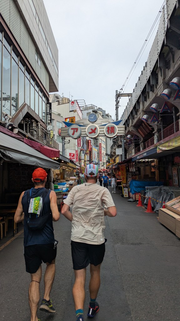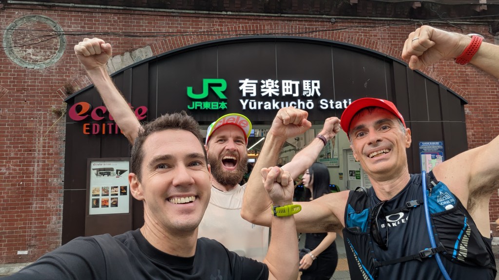 At Yurakucho, the final station, we were so close we could taste the end. We sped up to a 5:10 min/km pace. We cruised beneath the train tracks, along the yakitori and standing bars – still daytime so uncrowded yet alive with energy. It’s a bit of an odd area with old Tokyo charm written all over it but also a modern business district filled with skyscrapers.
