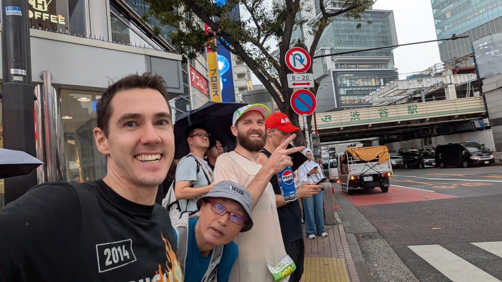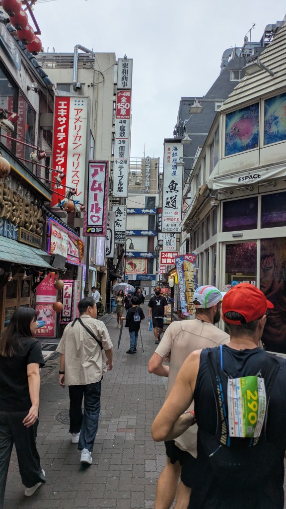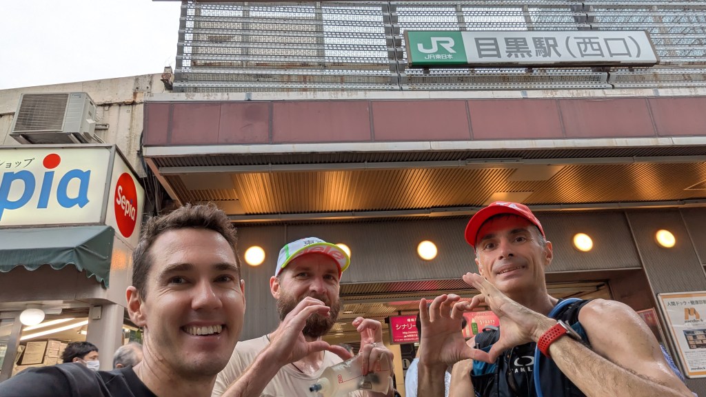 In Shibuya we found a convenience store that met Alain’s requirement of having chairs. I had thought it totally unnecessary but quickly changed my tune as we devoured food on the sublime seats. The tuna mayo onigiri, chicken cheese stick and block of yokan all went down easy – washed down with satisfying Pocari Sweat. And of course, while recharging, we were graced with the purple team running down the sidewalk yet again!